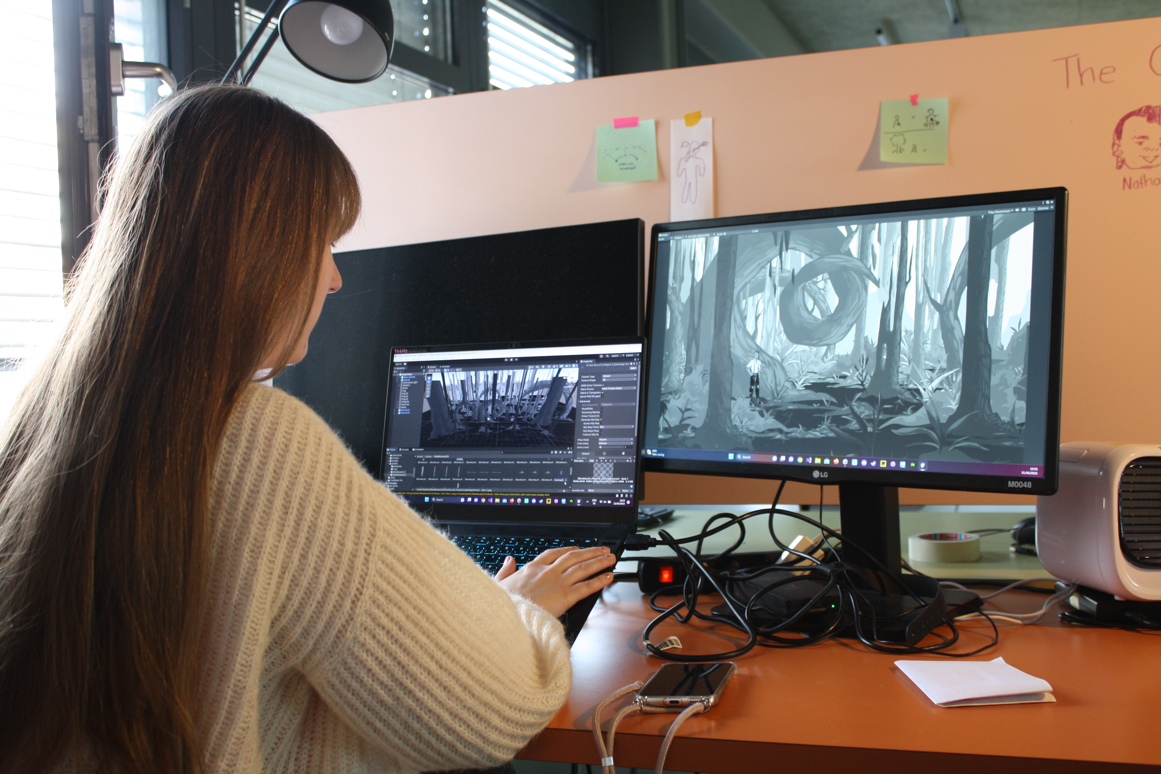 The process for this visual novel was a little different than usual, as the team was working on an idea that two of the team members had brought with them from a previous project, rather than developing it together.We faced challenges that took us away from our original plans. Our story script was completed just before the final showcase, which meant that the team worked mostly without a clear shared vision, leading to misunderstandings and last-minute adjustments. Nevertheless, I had the opportunity to learn a lot during this project, as it was my first time working as a technical artist, delving deeper into Unity and working on level design and UI animations.